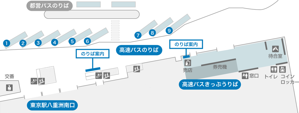 JR東京駅下車・八重洲南口改札を出て、バスのりばを右に曲がり、9番のりば先の右側。迷う心配もありませんし、雨に濡れる心配もありません。
